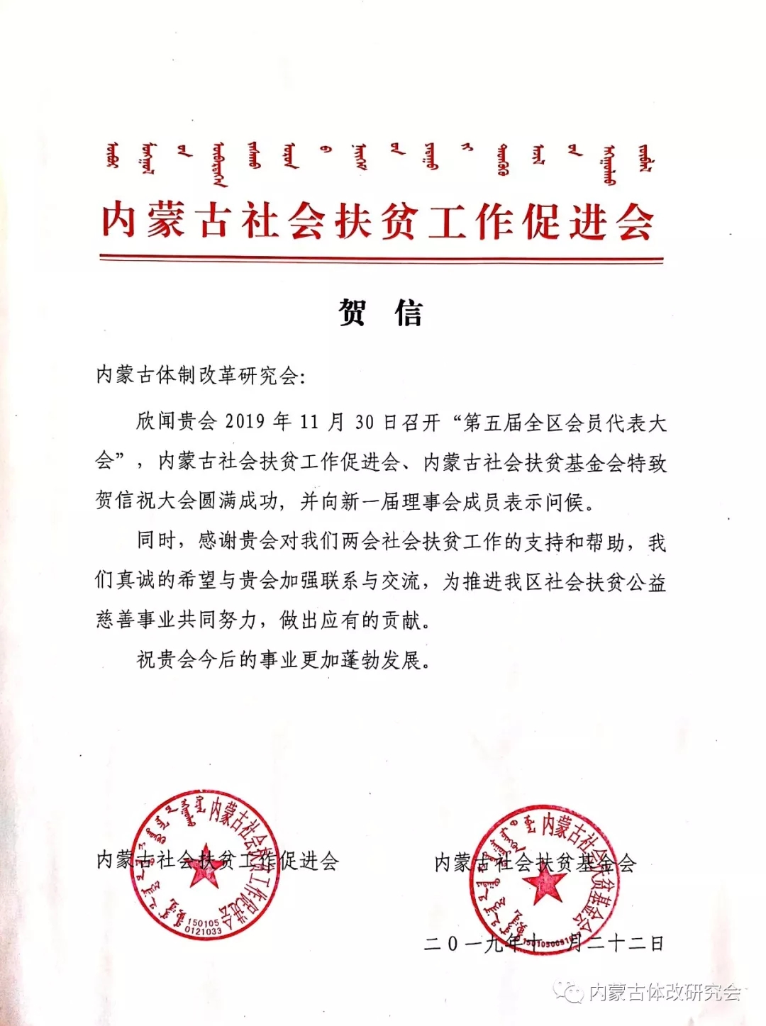 內(nèi)蒙古社會扶貧工作促進(jìn)會、內(nèi)蒙古社會扶貧基金會發(fā)來賀信