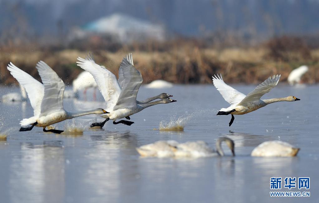 候鳥在位于江西鄱陽湖畔的五星農(nóng)場境內(nèi)振翅起飛(2018年1月11日攝)。新華社記者 萬象 攝