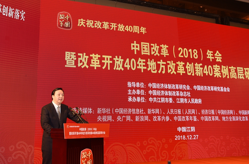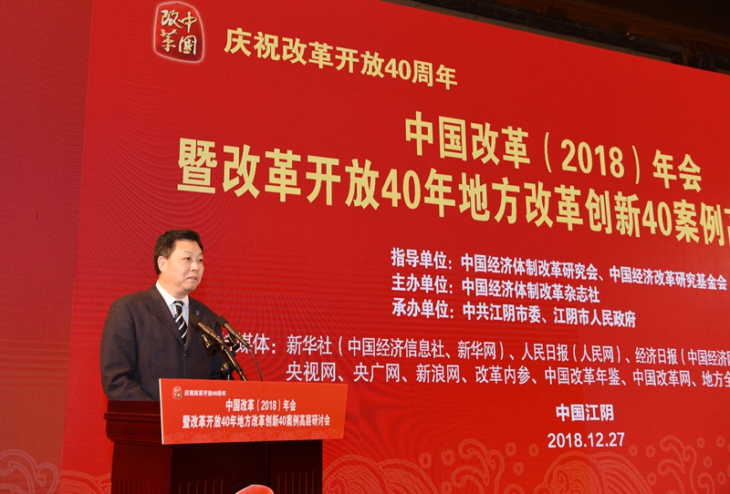 2018年12月27日,由中國經(jīng)濟(jì)體制改革研究會(huì)、中國經(jīng)濟(jì)改革研究基金會(huì)指導(dǎo),中國經(jīng)濟(jì)體制改革雜志社主辦,中共江陰市委、江陰市人民政府承辦的“慶祝改革開放40周年——中國改革(2018)年會(huì)暨改革開放40年地方改革創(chuàng)新40案例高層研討會(huì)”在江蘇省江陰市召開。