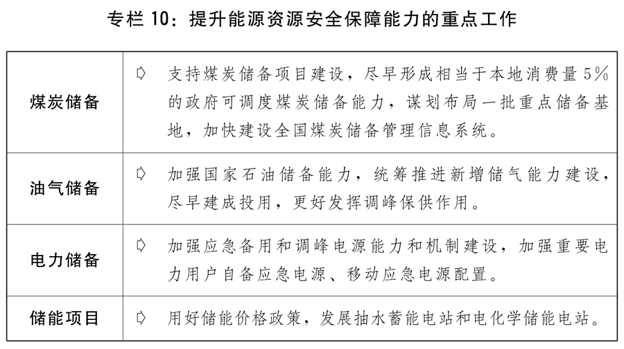 二是提升能源資源安全保障能力。深入推進煤電油氣產(chǎn)供儲銷體系建設(shè)。推進石油儲備重大工程建設(shè),加快華北、西北等地下儲氣庫新建和擴容達容建設(shè)。有序核增一批煤炭先進產(chǎn)能,加快提升煤炭儲備能力。加強抽水蓄能等調(diào)峰電源建設(shè),繼續(xù)發(fā)揮傳統(tǒng)能源特別是煤炭、煤電的兜底保供和調(diào)峰作用,積極推進現(xiàn)有煤電項目改造升級。推進白鶴灘、羊曲等重大水電工程建設(shè)。加大力度規(guī)劃建設(shè)以大型風(fēng)光電基地為基礎(chǔ)、以其周邊清潔高效先進節(jié)能的煤電為支撐、以穩(wěn)定安全可靠的特高壓輸變電線路為載體的新能源供給消納體系。加快推進國家儲備建設(shè),健全統(tǒng)一的戰(zhàn)略和應(yīng)急物資儲備體系。
