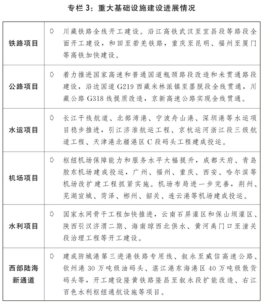 四是適度超前開展重大基礎(chǔ)設(shè)施建設(shè)。精準(zhǔn)有效推進交通、水利、物流、能源、新型基礎(chǔ)設(shè)施、民生等領(lǐng)域重大基礎(chǔ)設(shè)施項目建設(shè)。推進川藏鐵路、西部陸海新通道、沿江高鐵、一批鐵路專用線重點項目和川藏公路G318線提質(zhì)改造等加快建設(shè)。整體推進京津冀、長三角、粵港澳大灣區(qū)城市群城際鐵路、市域(郊)鐵路建設(shè)。鼓勵推廣軌道交通+土地綜合開發(fā)模式經(jīng)驗。做好中長期鐵路網(wǎng)、國家公路網(wǎng)和全國港口與航道布局規(guī)劃修編,強化國家公路、港口和高等級航道網(wǎng)絡(luò)功能。推動三峽水運新通道研究論證。實施國家水網(wǎng)重大工程。加快發(fā)展公鐵水多式聯(lián)運。提升樞紐機場綜合保障能力和服務(wù)水平,加快培育支線航空市場,提高國際航空貨運能力。加快“支點城市+骨干走廊”現(xiàn)代流通網(wǎng)絡(luò)建設(shè)。穩(wěn)步推進國家物流樞紐、國家骨干冷鏈物流基地建設(shè),強化冷鏈運輸環(huán)節(jié)疫情防控措施,完善“321”冷鏈物流運行體系。加快物流業(yè)制造業(yè)融合創(chuàng)新發(fā)展,積極推動多式聯(lián)運、智慧物流等新業(yè)態(tài)新模式發(fā)展。布局一批新型基礎(chǔ)設(shè)施項目,加快推進5G、千兆光網(wǎng)、一體化大數(shù)據(jù)中心、北斗產(chǎn)業(yè)化重大工程、民用空間基礎(chǔ)設(shè)施等建設(shè),推動傳統(tǒng)基礎(chǔ)設(shè)施智能化改造。