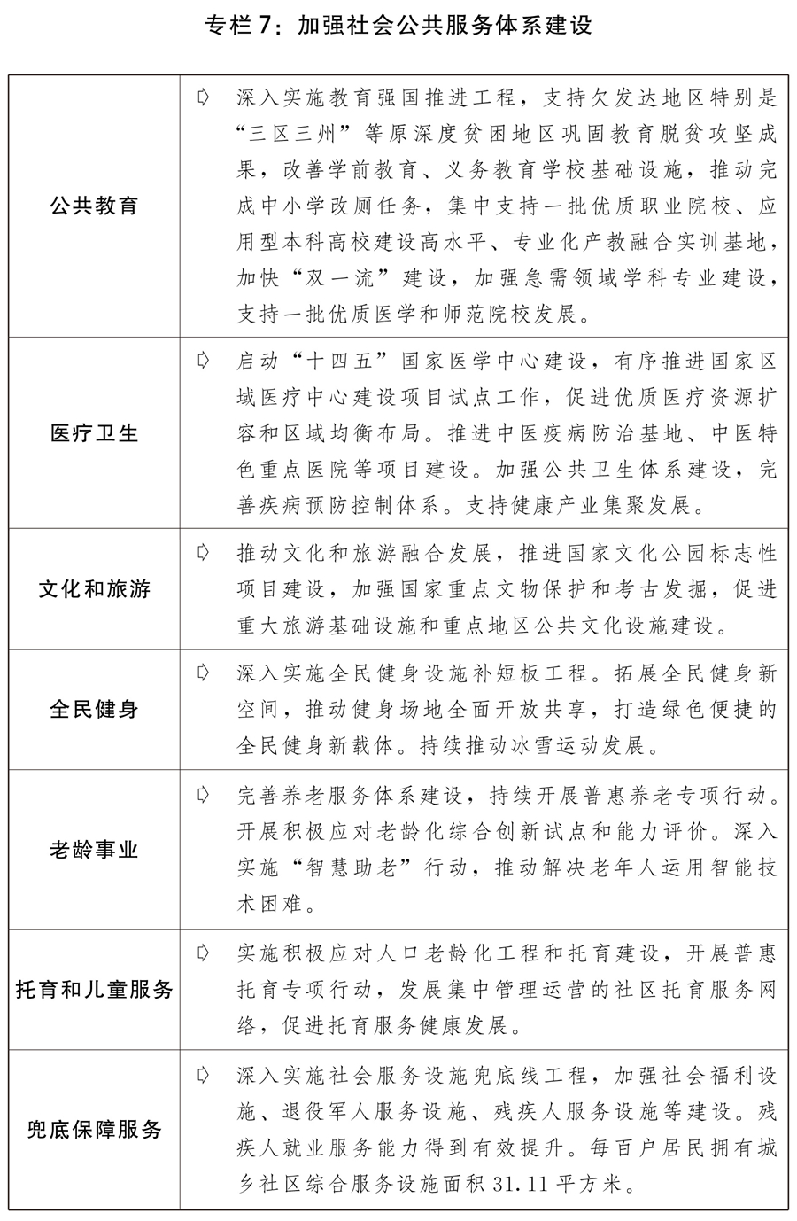四是完善公共服務(wù)政策制度體系。分類推進基本公共服務(wù)均等化發(fā)展,推動服務(wù)重心向基層下沉,增加普惠性非基本公共服務(wù)供給。支持社會力量增加普惠性托育服務(wù)供給,進一步完善學(xué)前教育收費政策,推進普惠性學(xué)前教育資源擴容增效,推進兒童友好城市建設(shè)。推動義務(wù)教育優(yōu)質(zhì)均衡發(fā)展和城鄉(xiāng)一體化,提升農(nóng)村學(xué)校辦學(xué)能力,依據(jù)常住人口規(guī)模增加城鎮(zhèn)教育資源。繼續(xù)做好義務(wù)教育階段減負(fù)工作。加強縣域普通高中建設(shè)。改善職業(yè)教育辦學(xué)條件。推進高校“雙一流”建設(shè),加快經(jīng)濟社會發(fā)展重點領(lǐng)域急需學(xué)科專業(yè)建設(shè)、人才培養(yǎng)和科技攻關(guān),完善產(chǎn)教融合政策措施。支持中西部高等教育發(fā)展,高校招生繼續(xù)加大對中西部和農(nóng)村地區(qū)傾斜力度。加強教師隊伍建設(shè),加大中西部地區(qū)教師培訓(xùn)力度。辦好特殊教育、繼續(xù)教育,規(guī)范民辦教育發(fā)展。完善三孩生育政策配套措施,將3歲以下嬰幼兒照護費用納入個人所得稅專項附加扣除,推動生育支持政策落地見效。貫徹落實積極應(yīng)對人口老齡化國家戰(zhàn)略,加強養(yǎng)老托育服務(wù)體系和健康支撐體系建設(shè),維護好老年人合法權(quán)益。推動公立醫(yī)院高質(zhì)量發(fā)展,加快健全現(xiàn)代醫(yī)院管理制度,深入推進國家醫(yī)學(xué)中心、國家區(qū)域醫(yī)療中心建設(shè)項目和縣級醫(yī)院建設(shè),加快完善分級診療體系,深化醫(yī)療服務(wù)價格、醫(yī)保支付管理和公立醫(yī)院薪酬制度改革。補齊婦幼兒科、精神衛(wèi)生、老年醫(yī)學(xué)等服務(wù)短板。持續(xù)深入開展愛國衛(wèi)生運動、推進實施健康中國行動,倡導(dǎo)文明健康綠色環(huán)保生活方式。實施現(xiàn)代化疾控體系建設(shè)、國家重大傳染病防治基地建設(shè)等工程,提升公共衛(wèi)生防控救治能力。加快中醫(yī)藥特色發(fā)展。推動中華優(yōu)秀傳統(tǒng)文化創(chuàng)造性轉(zhuǎn)化和創(chuàng)新性發(fā)展,促進出版、電影、廣播電視、文物等事業(yè)高質(zhì)量發(fā)展,推進公共文化數(shù)字化建設(shè),提供更多公共文化產(chǎn)品。加強國家重大文化項目和國家文化公園建設(shè),加強重要文化遺產(chǎn)和國家公園等重要自然遺產(chǎn)保護設(shè)施建設(shè),全面提升革命文物保護利用水平,促進公共文化服務(wù)提質(zhì)升級。推進國民旅游休閑加快發(fā)展,不斷完善節(jié)假日制度。實施全民健身設(shè)施補短板工程,加強體育公園等全民健身場地設(shè)施建設(shè)。深化公共法律服務(wù)體系建設(shè)。