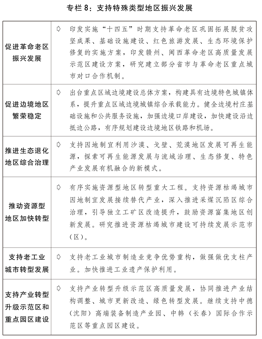 二是提高區(qū)域協(xié)調(diào)發(fā)展水平。推動西部大開發(fā)形成新格局,發(fā)揮風(fēng)、光、水電和礦產(chǎn)資源優(yōu)勢建設(shè)大型清潔能源基地。積極發(fā)展文化和旅游產(chǎn)業(yè)。實施重要生態(tài)系統(tǒng)保護和修復(fù)工程,加快重大項目規(guī)劃建設(shè)。推進貴州大數(shù)據(jù)綜合試驗區(qū)建設(shè)。積極穩(wěn)妥推進雅魯藏布江下游水電開發(fā)等重大工程。推動?xùn)|北振興取得新突破,組織實施好東北全面振興“十四五”實施方案,繼續(xù)推進黑瞎子島中俄國際合作示范區(qū)建設(shè),積極推動大小興安嶺林區(qū)生態(tài)保護與經(jīng)濟轉(zhuǎn)型,穩(wěn)步推進長吉圖開發(fā)開放先導(dǎo)區(qū)發(fā)展,推動《東北振興重點項目三年滾動實施方案》重點項目加快建設(shè)。推動中部地區(qū)高質(zhì)量發(fā)展,推動湘鄂贛協(xié)同高質(zhì)量發(fā)展,支持晉陜豫黃河金三角承接產(chǎn)業(yè)轉(zhuǎn)移示范區(qū)建設(shè),支持山西進一步深化能源革命綜合改革試點,推進淮海合作區(qū)協(xié)同發(fā)展,支持中國(武漢)光谷建設(shè),編制出臺洞庭湖生態(tài)經(jīng)濟區(qū)規(guī)劃。鼓勵東部加快高質(zhì)量發(fā)展,支持福建高質(zhì)量發(fā)展及平潭綜合實驗區(qū)建設(shè),推動山東新舊動能轉(zhuǎn)換綜合試驗區(qū)建設(shè)取得新進展。支持民族地區(qū)改善生產(chǎn)生活條件,加強各民族交流交往交融,鑄牢中華民族共同體意識。推動革命老區(qū)、邊境地區(qū)、生態(tài)退化地區(qū)、資源型地區(qū)、老工業(yè)城市等特殊類型地區(qū)振興發(fā)展,推進國家級新區(qū)、臨空經(jīng)濟示范區(qū)、承接產(chǎn)業(yè)轉(zhuǎn)移示范區(qū)等功能平臺建設(shè),推動國家自主創(chuàng)新示范區(qū)和高新區(qū)高質(zhì)量發(fā)展。支持海洋經(jīng)濟發(fā)展示范區(qū)、現(xiàn)代海洋城市等建設(shè),提升海洋資源開發(fā)利用水平。