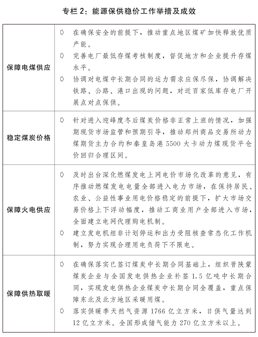 三是糧食能源等重要資源保供穩(wěn)價工作有力有效。針對玉米、煤炭、鐵礦石、銅鋁鋅等大宗商品價格異常波動,及時采取供需雙向調(diào)節(jié)、期現(xiàn)貨市場聯(lián)動監(jiān)管、預(yù)期引導(dǎo)等措施,打出保供穩(wěn)價的政策組合拳,有力促進了價格回歸合理區(qū)間。加強糧食市場調(diào)控,合理安排進口和政策性糧食庫存銷售,有效保障糧食市場穩(wěn)定供應(yīng)。加強期貨市場監(jiān)管和新棉收購引導(dǎo),適時增加中央儲備棉投放,促進棉花市場平穩(wěn)有序運行。著力解決煤炭電力供應(yīng)緊張問題,推動煤炭增產(chǎn)增供和價格回歸合理水平,支持發(fā)電供熱企業(yè)紓困解難,提升煤電支撐保障能力,改革完善煤電價格市場化形成機制,擴大市場交易價格上下浮動幅度,加強煤炭、液化天然氣(LNG)等能源物資產(chǎn)運需銜接和運輸保障,確保民生和公共用能需求,推進全社會節(jié)約用電。發(fā)揮跨部門協(xié)調(diào)工作機制作用,做好化肥市場保供穩(wěn)價工作。制定實施原材料價格上漲應(yīng)對方案以及分品種保供穩(wěn)價工作方案。發(fā)揮國家儲備市場調(diào)節(jié)作用,分批投放原油成品油和銅鋁鋅等國家儲備。