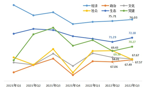 1、從領(lǐng)域來看,社會(huì)領(lǐng)域降幅略高于其他領(lǐng)域。第三季度,經(jīng)濟(jì)領(lǐng)域76.03,政治領(lǐng)域67.49 ,文化領(lǐng)域67.67,社會(huì)領(lǐng)域67.57,生態(tài)領(lǐng)域72.18,黨建領(lǐng)域70.27。與上一季度相比,經(jīng)濟(jì)、政治、生態(tài)、黨建領(lǐng)域上升,文化、社會(huì)領(lǐng)域下降。