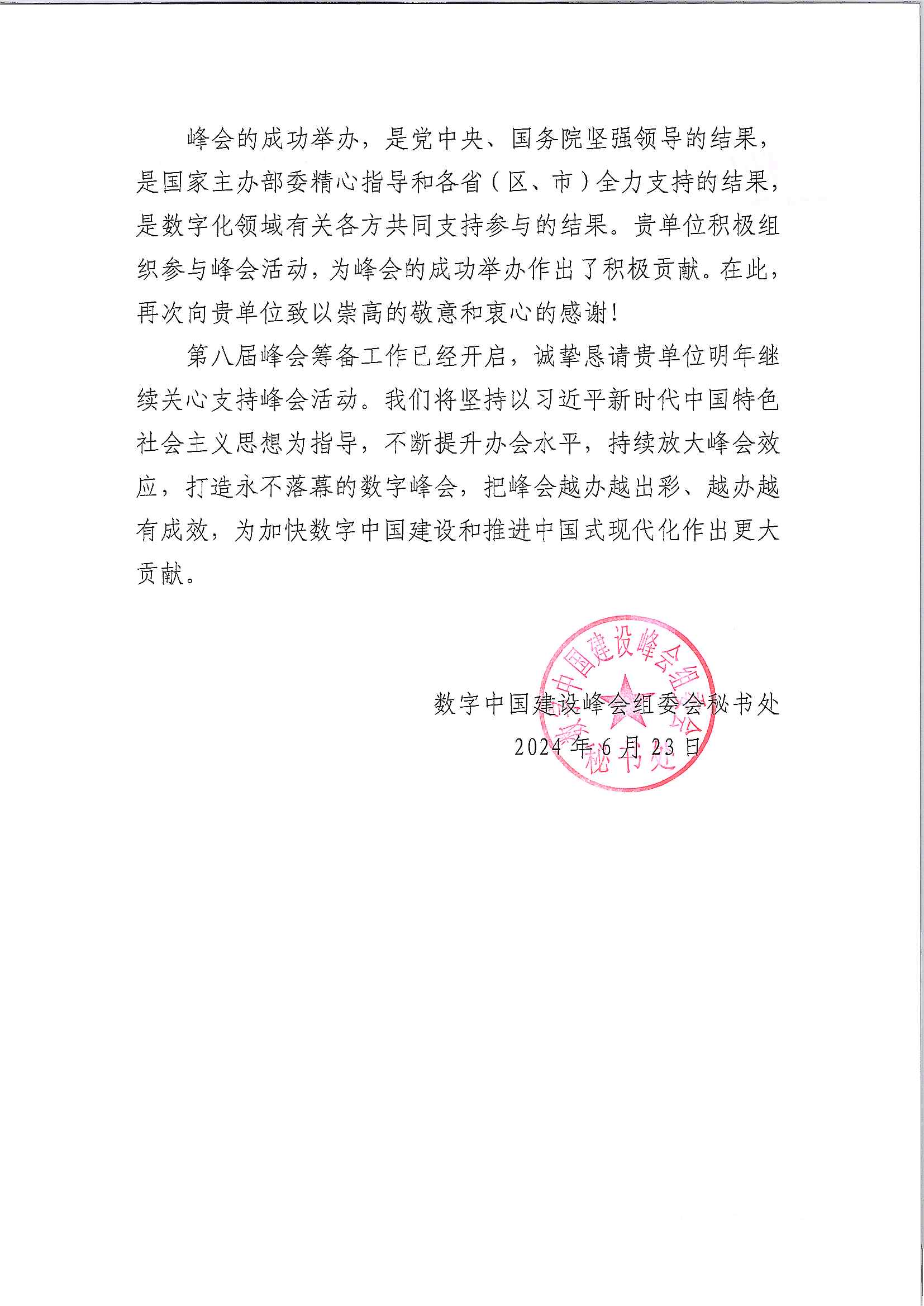 日前,我會收到來自數(shù)字中國建設峰會組委會的感謝信。信中就我會對第七屆數(shù)字中國建設峰會成功舉辦的支持表示感謝。未來我會將繼續(xù)積極組織參與峰會活動,為加快數(shù)字中國建設和推進中國式現(xiàn)代化作出更大貢獻。