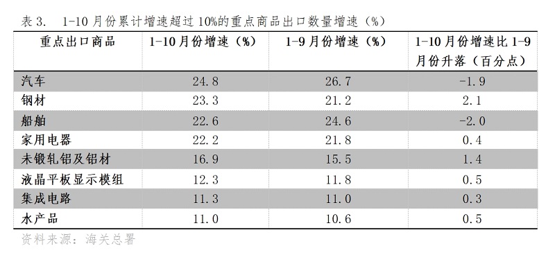 1-10月份,累計(jì)出口數(shù)量增長(zhǎng)速度超過10%的重點(diǎn)商品共有8類,與1-9月份持平,其中6類增速回升,2類增速回落,即汽車出口增長(zhǎng)24.8%,鋼材出口增長(zhǎng)23.3%,船舶出口增長(zhǎng)22.6%,家用電器出口增長(zhǎng)22.2%,未鍛軋鋁及鋁材出口增長(zhǎng)16.9%,液晶平板顯示模組出口增長(zhǎng)12.3%,集成電路出口增長(zhǎng)11.3%,水產(chǎn)品出口增長(zhǎng)11.0%。