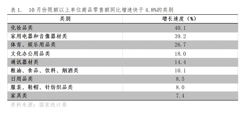 10月份,限額以上單位商品零售額增速快于社會(huì)消費(fèi)品零售總額4.8%增速的共有9類,即化妝品類同比增長(zhǎng)40.1%,家用電器和音像器材類增長(zhǎng)39.2%,體育、娛樂用品類增長(zhǎng)26.7%,文化辦公用品類增長(zhǎng)18.0%,通訊器材類增長(zhǎng)14.4%,糧油、食品、飲料、煙酒類增長(zhǎng)10.1%,日用品類增長(zhǎng)8.5%,服裝、鞋帽、針紡織品類增長(zhǎng)8.0%,家具類增長(zhǎng)7.4%。