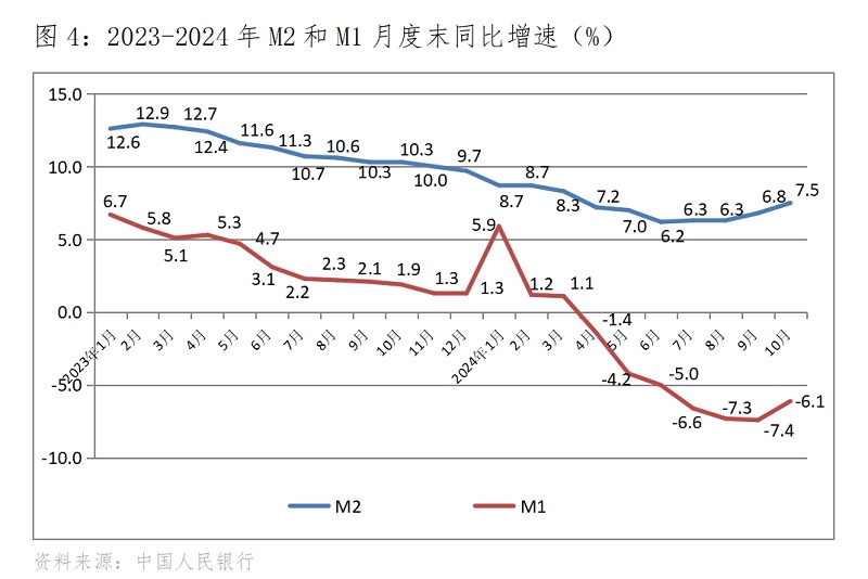 (四)M2增速持續(xù)回升。10月末,廣義貨幣供應(yīng)量(M2)同比增長(zhǎng)7.5%,比9月末增長(zhǎng)6.8%回升0.7個(gè)百分點(diǎn),9月末增速比8月末增速回升了0.5個(gè)百分點(diǎn);狹義貨幣供應(yīng)量(M1)降幅由擴(kuò)大轉(zhuǎn)為縮小,10月末同比下降6.1%,比9月末下降7.4%縮小1.3個(gè)百分點(diǎn),而9月末降幅比8月末降幅擴(kuò)大0.1個(gè)百分點(diǎn),扭轉(zhuǎn)了自5月末以來降幅逐月擴(kuò)大的趨勢(shì);流通中貨幣(M0)增速由落轉(zhuǎn)升,10月末同比增長(zhǎng)12.8%,比9月末增長(zhǎng)11.5%回升了1.3個(gè)百分點(diǎn),而9月末增速比8月末增速回落了0.7個(gè)百分點(diǎn)。貨幣供應(yīng)量增速的回升或降幅的縮小,對(duì)經(jīng)濟(jì)回升將發(fā)揮著積極的重要作用。