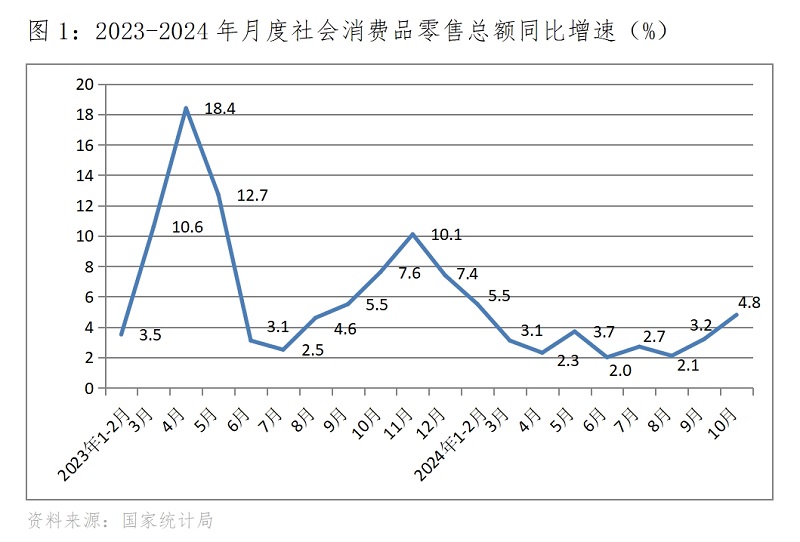 (一)零售增速繼續(xù)回升。10月份,社會(huì)消費(fèi)品零售總額同比增長(zhǎng)4.8%,比9月份增長(zhǎng)3.2%回升了1.6個(gè)百分點(diǎn),9月份比8月份增長(zhǎng)2.1%回升了1.1個(gè)百分點(diǎn)。社會(huì)消費(fèi)品零售總額增速的持續(xù)回升,既反映了政策措施取得了積極效果,也說明消費(fèi)者對(duì)有效政策措施的響應(yīng)較為積極。隨著消費(fèi)品以舊換新政策措施力度的不斷加大,家用電器和音像器材以及汽車零售額增長(zhǎng)加快或由負(fù)轉(zhuǎn)正,10月份限額以上企業(yè)家用電器和音像器材零售額增長(zhǎng)39.2%,比9月份加快17.7個(gè)百分點(diǎn),9月份比8月份加快17.1個(gè)百分點(diǎn);汽車零售額增長(zhǎng)3.7%,比9月份加快3.3個(gè)百分點(diǎn),9月份為增長(zhǎng)0.4%,8月份為下降7.3%。可見,實(shí)施有效的政策措施對(duì)擴(kuò)大消費(fèi)的效果是明顯的積極的。