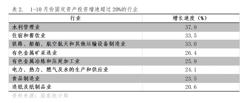1-10月份,固定資產(chǎn)投資增速超過20%的行業(yè)共8個(gè),即水利管理業(yè)增長(zhǎng)37.9%,住宿和餐飲業(yè)增長(zhǎng)33.5%,鐵路、船舶、航空航天和其他運(yùn)輸設(shè)備制造業(yè)增長(zhǎng)33.0%,有色金屬礦采選業(yè)增長(zhǎng)26.4%,有色金屬冶煉和壓延加工業(yè)增長(zhǎng)25.9%,電力、熱力、燃?xì)饧八纳a(chǎn)和供應(yīng)業(yè)增長(zhǎng)24.1%,食品制造業(yè)增長(zhǎng)23.5%,造紙及紙制品業(yè)增長(zhǎng)20.6%。