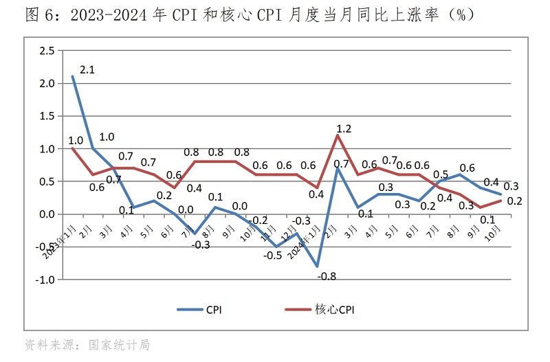 (二) CPI漲幅繼續(xù)回落。10月份,CPI同比上漲0.3%,比9月份上漲0.4%回落了0.1個(gè)百分點(diǎn),而9月份比8月份回落0.2個(gè)百分點(diǎn),延續(xù)了上月回落的態(tài)勢(shì)。其中食品價(jià)格上漲2.9%,比上月上漲3.3%回落0.4個(gè)百分點(diǎn);非食品價(jià)格下降0.3%,比上月下降0.2%擴(kuò)大0.1百分點(diǎn)。10月份,核心CPI同比上漲0.2%,比9月份上漲0.1%回升了0.1個(gè)百分點(diǎn)。CPI和核心CPI漲幅,雖然比上月一落一升,但由于漲幅都仍還比較低,說明市場(chǎng)需求仍還較為疲弱。