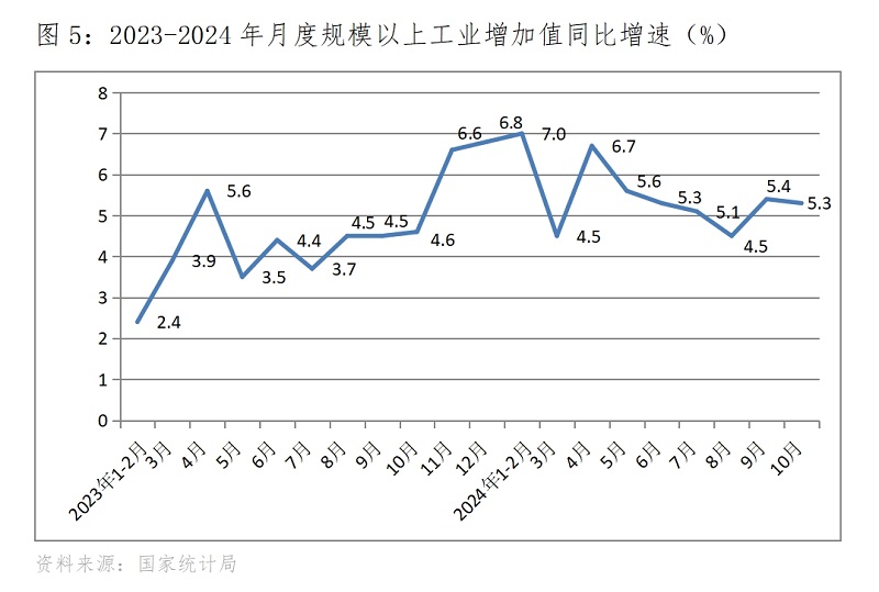 (一)工業(yè)增速由升轉(zhuǎn)落。10月份,規(guī)模以上工業(yè)增加值同比增長(zhǎng)5.3%,比9月份增長(zhǎng)5.4%回落了0.1個(gè)百分點(diǎn),9月份比8月份回升了0.9個(gè)百分點(diǎn)。10月份工業(yè)增速回落,雖然幅度不大,但這是在9月份回升后的回落,也是在上年同期基數(shù)并不高的基礎(chǔ)上的回落,而且還是在政策措施力度不斷加大下的回落,充分說明工業(yè)回升仍面臨著較大的壓力。