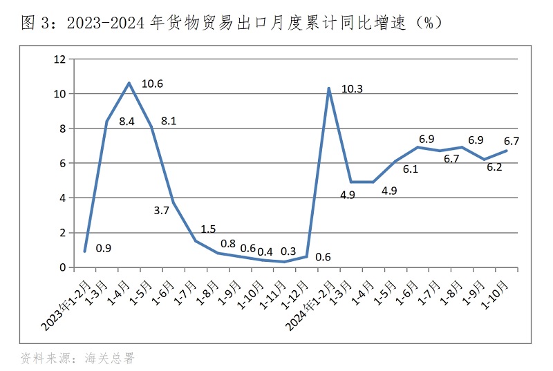 (三)貨物出口增速由落轉(zhuǎn)升。1-10月份,貨物出口同比增長(zhǎng)6.7%,比1-9月份增長(zhǎng)6.2%回升0.5個(gè)百分點(diǎn),1-9月份比1-8月份回落0.7個(gè)百分點(diǎn),呈現(xiàn)出增速由降轉(zhuǎn)升的態(tài)勢(shì)。貨物出口對(duì)主要貿(mào)易出口經(jīng)濟(jì)體增速全面回升,1-10月份對(duì)歐盟出口增長(zhǎng)3.5%,比1-9月份回升0.8個(gè)百分點(diǎn);對(duì)美國(guó)出口增長(zhǎng)4.9%,比1-9月份回升0.3個(gè)百分點(diǎn);對(duì)東盟出口增長(zhǎng)12.5%,比1-9月份回升0.2個(gè)百分點(diǎn);對(duì)拉丁美洲出口增長(zhǎng)14.5%,比1-9月份回升0.8個(gè)百分點(diǎn)。