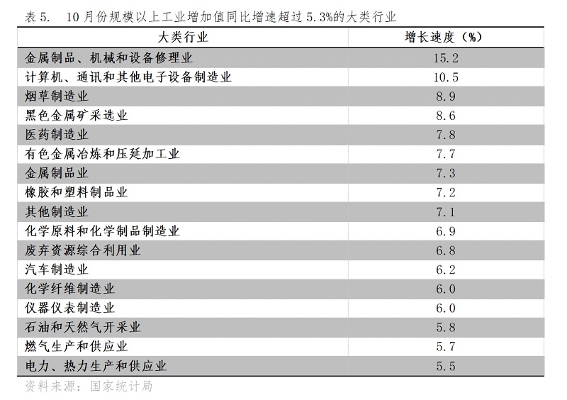 10月份,增長(zhǎng)速度超過規(guī)模以上工業(yè)增長(zhǎng)5.3%的主要大類行業(yè)共有17個(gè),即金屬制品、機(jī)械和設(shè)備修理業(yè)同比增長(zhǎng)15.2%,計(jì)算機(jī)、通訊和其他電子設(shè)備制造業(yè)增長(zhǎng)10.5%,煙草制造業(yè)增長(zhǎng)8.9%,黑色金屬礦采選業(yè)增長(zhǎng)8.6%,醫(yī)藥制造業(yè)增長(zhǎng)7.8%,有色金屬冶煉和壓延加工業(yè)增長(zhǎng)7.7%,金屬制品業(yè)增長(zhǎng)7.3%,橡膠和塑料制品業(yè)增長(zhǎng)7.2%,其他制造業(yè)增長(zhǎng)7.1%,化學(xué)原料和化學(xué)制品制造業(yè)增長(zhǎng)6.9%,廢棄資源綜合利用業(yè)增長(zhǎng)6.8%,汽車制造業(yè)增長(zhǎng)6.2%,化學(xué)纖維制造業(yè)增長(zhǎng)6.0%,儀器儀表制造業(yè)增長(zhǎng)6.0%,石油和天然氣開采業(yè)增長(zhǎng)5.8%,燃?xì)馍a(chǎn)和供應(yīng)業(yè)增長(zhǎng)5.7%,電力、熱力生產(chǎn)和供應(yīng)業(yè)增長(zhǎng)5.5%。