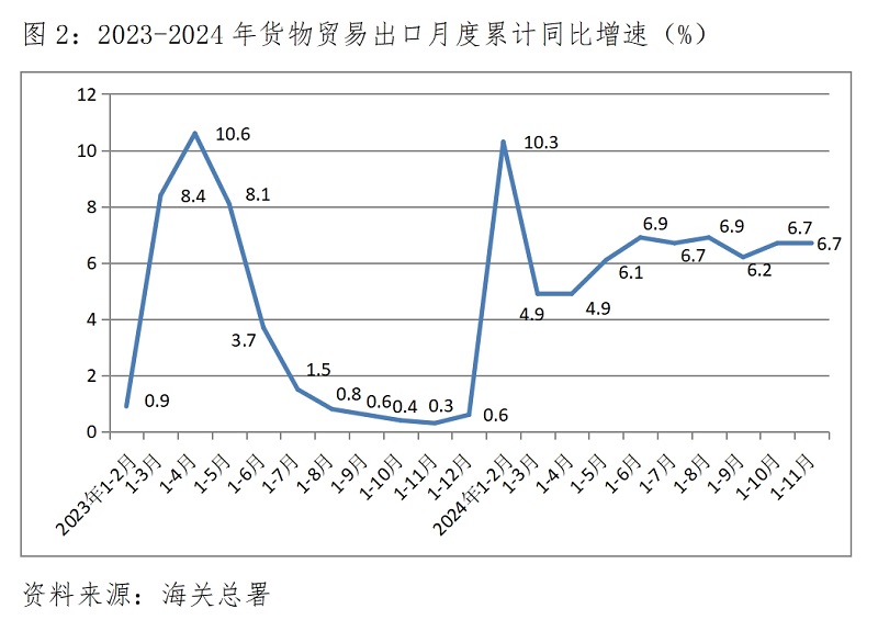 (二)貨物出口增速由升轉平。1-11月份,貨物出口同比增長6.7%,與1-10月份增速持平,1-10月份增速比1-9月份增速6.2%回升0.5個百分點。對歐盟、美國和東盟等貨物出口增速全面回升,1-11月份對歐盟出口增長3.8%,比1-10月份回升0.3個百分點;對美國出口增長5.1%,比1-10月份回升0.2個百分點;對東盟出口增長12.7%,比1-10月份回升0.2個百分點;但對拉丁美洲出口增長14.1%,比1-10月份回落0.4個百分點。