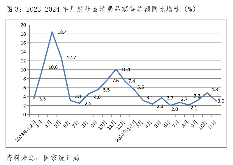 (一)零售增速由升轉落。11月份,社會消費品零售總額同比增長3.0%,比10月份增長4.8%回落1.8個百分點,而10月份增速比9月份增速3.2%回升了1.6個百分點。但受消費品以舊換新政策措施的持續(xù)作用,家用電器和音像器材和汽車銷售仍保持較快增長,11月份限額以上企業(yè)家用電器和音像器材零售額繼續(xù)保持調整增長22.2%,已連續(xù)3個月保持兩位數(shù)增長;汽車零售額增長6.6%,比上月回升2.9個百分點,10月份比9月份回升3.3個百分點,已連續(xù)兩個月以大約3.0個百分點回升。