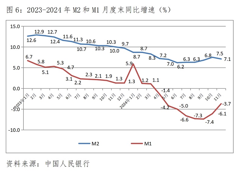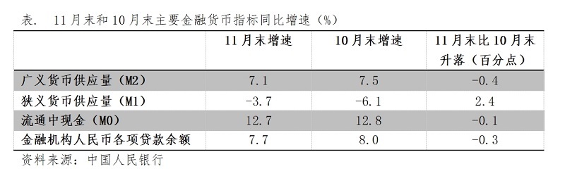 (四)M2增速由升轉落。11月末,廣義貨幣供應量(M2)同比增長7.1%,比10月末增長7.5%回落0.4個百分點,10月末增速比9月末增速回升0.7個百分點;狹義貨幣供應量(M1)降幅繼續(xù)縮小,11月末同比下降3.7%,比10月末同比下降6.1%縮小2.4個百分點,10月末降幅比9月末降幅縮小1.3個百分點;流通中貨幣(M0)增速由升轉落,11月末同比增長12.7%,比10月末增長12.8%回落0.1介百分點,10月末增速比9月末增速回升了1.3個百分點。各層次貨幣供應量又出現(xiàn)了不同方向的變化走勢。