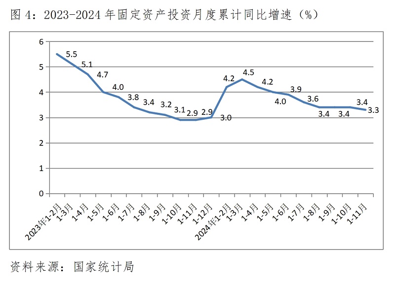 (二)投資增速由持平轉小幅回落。1-11月份,固定資產(chǎn)投資同比增長3.3%,與1-10月份增長3.4%回落0.1個百分點,1-10月份增速與1-9月份持平,投資增速在保持連續(xù)3個月持平后出現(xiàn)了小幅回落。國有控股投資增速略有回落,1-11月份比1-10月份回落0.1個百分點;民間投資降幅略有擴大,1-11月份比1-10月份擴大0.1個百分點。三次產(chǎn)業(yè)投資中,第一產(chǎn)業(yè)投資增速回落0.1個百分點,第二產(chǎn)業(yè)投資增速回落0.2個百分點,第三產(chǎn)業(yè)投資降幅擴大0.1個百分點。