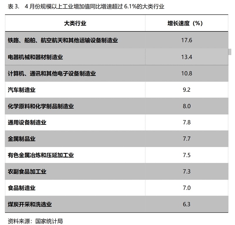 4月份,增長(zhǎng)速度超過規(guī)模以上工業(yè)增長(zhǎng)6.1%的主要大類行業(yè)共有11個(gè),即鐵路、船舶、航空航天和其他運(yùn)輸設(shè)備制造業(yè)增長(zhǎng)17.6%,電器機(jī)械和器材制造業(yè)增長(zhǎng)13.4%,計(jì)算機(jī)、通訊和其他電子設(shè)備制造業(yè)增長(zhǎng)10.8%,汽車制造業(yè)增長(zhǎng)9.2%,化學(xué)原料和化學(xué)制品制造業(yè)增長(zhǎng)8.0%,通用設(shè)備制造業(yè)增長(zhǎng)7.8%,金屬制品業(yè)增長(zhǎng)7.7%,有色金屬冶煉和壓延加工業(yè)增長(zhǎng)7.5%,農(nóng)副食品加工業(yè)增長(zhǎng)7.3%,食品制造業(yè)增長(zhǎng)7.0%,煤炭開采和洗選業(yè)增長(zhǎng)6.3%。