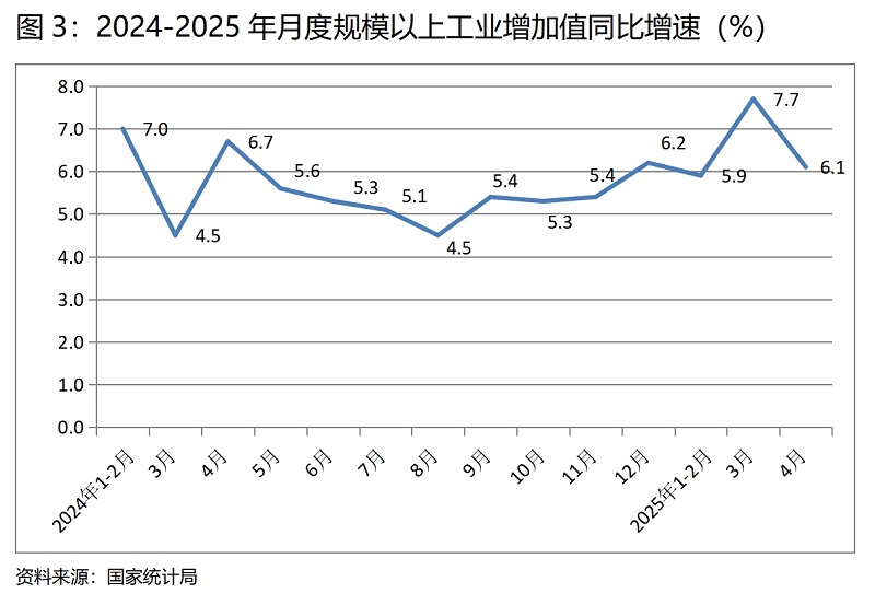 (三)工業(yè)增速由升轉(zhuǎn)落。4月份,規(guī)模以上工業(yè)增加值同比增長(zhǎng)6.1%,比上月增長(zhǎng)7.7%回落了1.6個(gè)百分點(diǎn),3月份比1-2月份回升了1.8個(gè)百分點(diǎn)。4月份工業(yè)增速出現(xiàn)回落,有上年同期高基數(shù)的因素,上年4月份增長(zhǎng)6.7%,如按兩年平均計(jì)算,增速為6.4%。從工業(yè)三大門類看,回落最多的是采礦業(yè),4月份比3月份回落了3.6個(gè)百分點(diǎn),電力、熱力、燃?xì)饧八a(chǎn)和供應(yīng)業(yè)回落了1.4個(gè)百分點(diǎn),制造業(yè)回落了1.3個(gè)百分點(diǎn)。