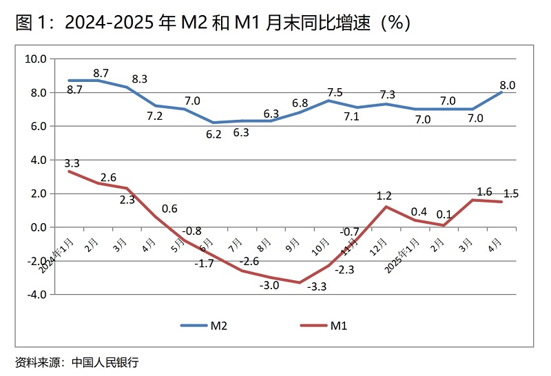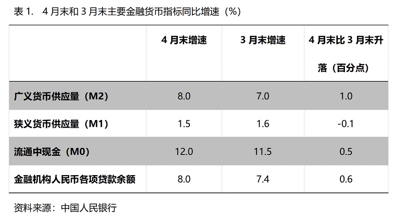 (一)M2增速由平轉(zhuǎn)升。4月末,廣義貨幣供應(yīng)量(M2)同比增長(zhǎng)8.0%,比3月末增長(zhǎng)7.0%回升1.0個(gè)百分點(diǎn),實(shí)際上這是在今年前三個(gè)月末連續(xù)保持7.0%增速基礎(chǔ)上的回升;狹義貨幣供應(yīng)量(M1)增速比上月略有回落,4月末同比增長(zhǎng)1.5%,比3月末增長(zhǎng)1.6%回落0.1個(gè)百分點(diǎn),而3月末增幅比2月末增幅回升1.5個(gè)百分點(diǎn);流通中貨幣(M0)增速由升轉(zhuǎn)落,4月末同比增長(zhǎng)12.0%,比3月末增長(zhǎng)11.5%回升0.5個(gè)百分點(diǎn),而3月末增速比2月末增速回升了1.8個(gè)百分點(diǎn)。貨幣政策正按照適度寬松的要求運(yùn)行,這對(duì)推動(dòng)經(jīng)濟(jì)回升將發(fā)揮積極作用,但各層次貨幣供應(yīng)量增速較大差異反映出的問題需引起關(guān)注。