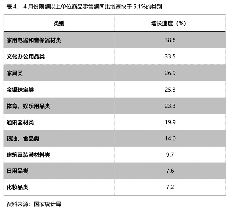 4月份,限額以上單位商品零售額增速快于社會(huì)消費(fèi)品零售總額5.1%增速的共有10類,即家用電器和音像器材類增長(zhǎng)38.8%,文化辦公用品類增長(zhǎng)33.5%,家具類增長(zhǎng)26.9%,金銀珠寶類增長(zhǎng)25.3%,體育、娛樂用品類增長(zhǎng)23.3%,通訊器材類增長(zhǎng)19.9%,糧油、食品類增長(zhǎng)14.0%,建筑及裝潢材料類增長(zhǎng)9.7%,日用品類增長(zhǎng)7.6%,化妝品類同比增長(zhǎng)7.2%。