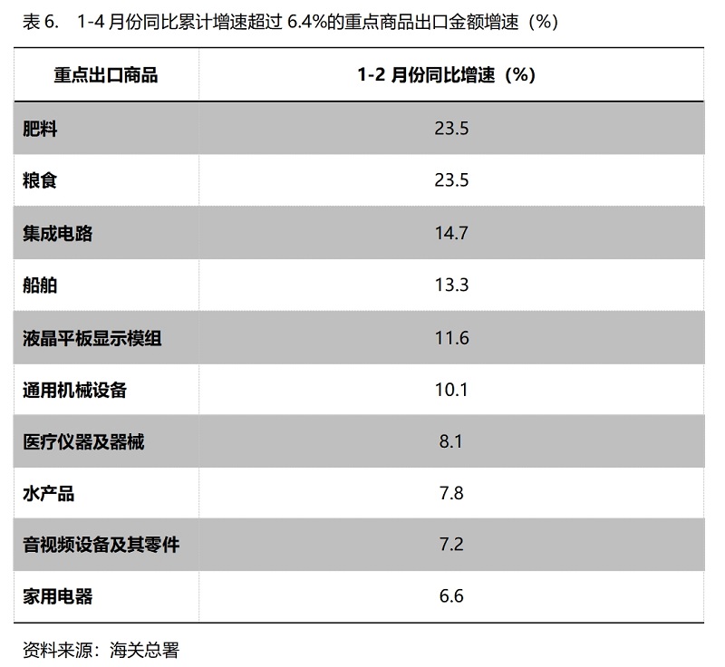 1-4月份,出口金額同比增速超過6.4%的重點(diǎn)商品共有10類,即肥料出口增長(zhǎng)23.5%,糧食增長(zhǎng)23.5%,集成電路增長(zhǎng)14.7%,船舶增長(zhǎng)13.3%,液晶平板顯示模組增長(zhǎng)11.6%,通用機(jī)器設(shè)備增長(zhǎng)10.1%,醫(yī)療儀器及器械增長(zhǎng)8.1%,水產(chǎn)品增長(zhǎng)7.8%,音視頻設(shè)備及其零件增長(zhǎng)7.2%,家用電器增長(zhǎng)6.6%。