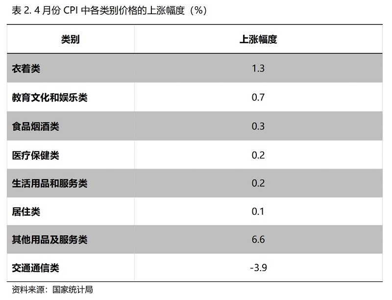 4月份,在CPI 8個(gè)類別中有7個(gè)類別保持上漲,1個(gè)類別下降。上漲的7個(gè)類別包括衣著類價(jià)格同比上漲1.3%,教育文化和娛樂類上漲0.7%,食品煙酒類上漲0.3%,醫(yī)療保健類上漲0.2%,生活用品及服務(wù)類上漲0.2%,居住類上漲0.1%,其他用品和服務(wù)類上漲6.6%;下降的雖然就交通通信類1個(gè)類別,但降幅較大,4月份同比下降3.9%。