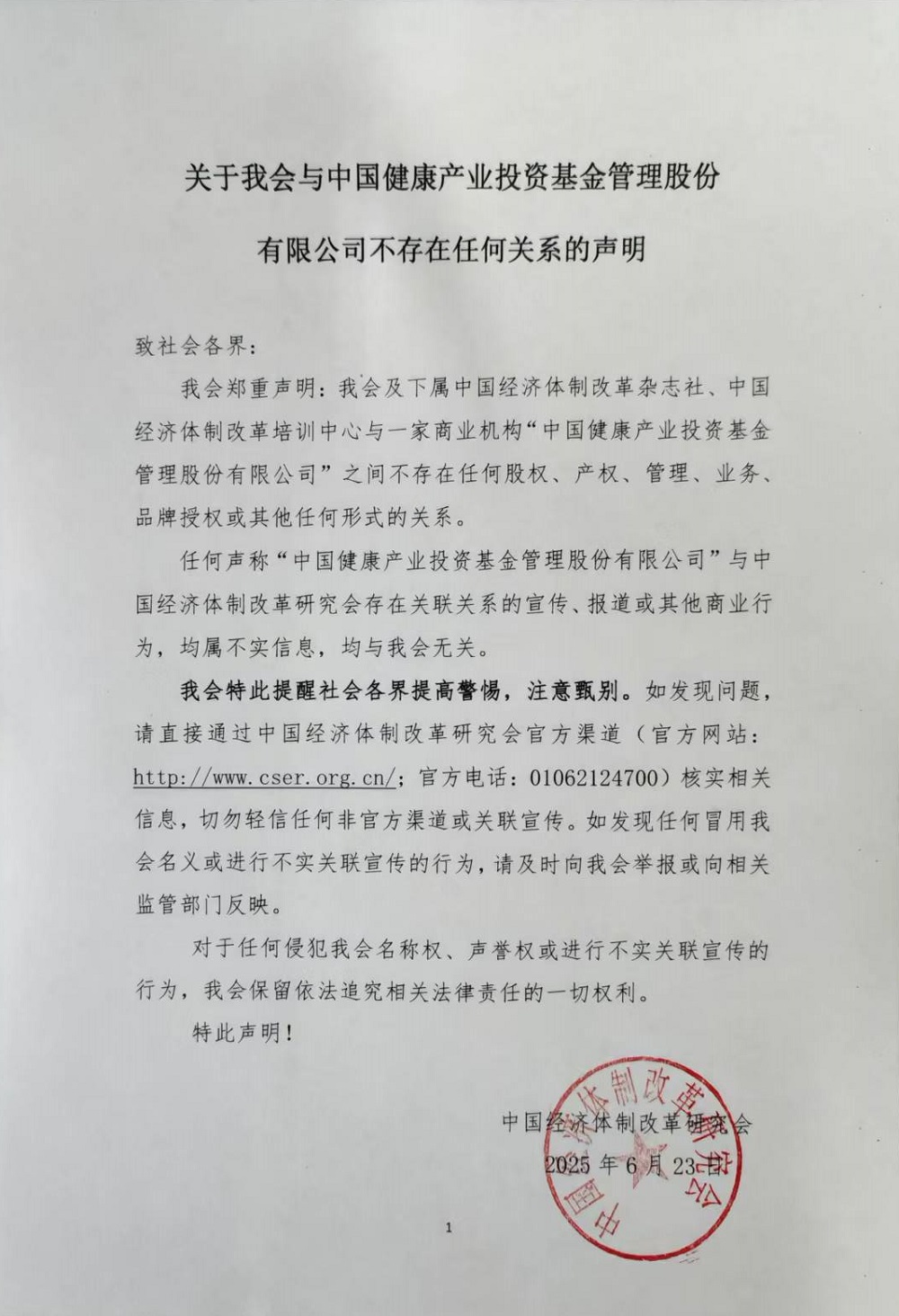 任何聲稱“中國(guó)健康產(chǎn)業(yè)投資基金管理股份有限公司”與中國(guó)經(jīng)濟(jì)體制改革研究會(huì)存在關(guān)聯(lián)關(guān)系的宣傳、報(bào)道或其他商業(yè)行為,均屬不實(shí)信息,均與我會(huì)無(wú)關(guān)。