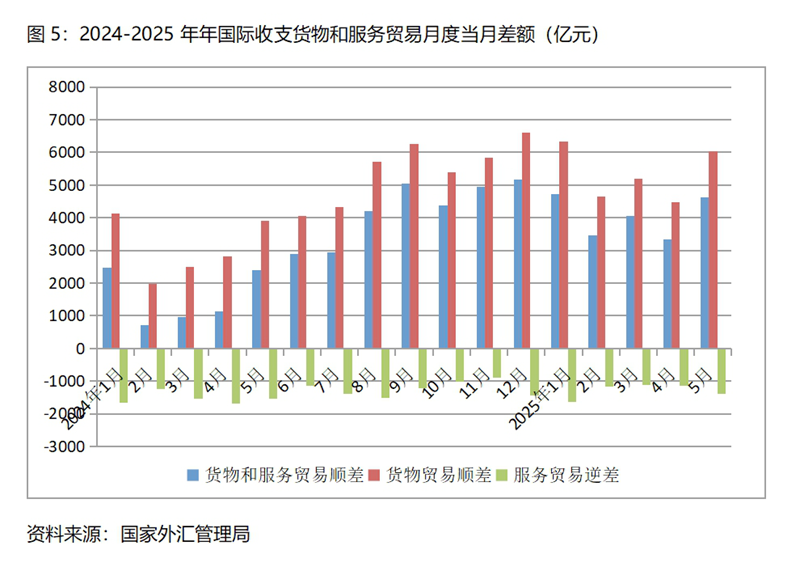 (四)國際收支貨物和服務貿(mào)易順差持續(xù)增加。今年1月份國際收支貨物和服務貿(mào)易順差比上年同月增加2252億元;2月份順差增加2735億元,3月順差增加3093億元,4月順差增加2199億元,5月順差增加2249億元,國際收支貨物和服務貿(mào)易順差比上年同期有著明顯的增加。在美國“對等關稅”政策的沖擊下,國際收支貨物和服務貿(mào)易仍實現(xiàn)較大的順差,足以說明我國經(jīng)濟有著較強的國際競爭力。