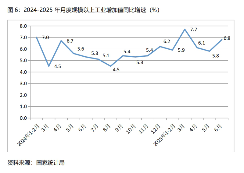 (一)工業(yè)生產(chǎn)增速比一季度略有回落,比上年同期回升。 上半年規(guī)模以上工業(yè)增加值同比增長6.4%,比一季度增長6.5%回落了0.1個百分點,比上年同期增長6.0%回升0.4個百分點。其中,采礦業(yè)同比增長6.0%,比一季度增長6.2%回落了0.2個百分點;制造業(yè)增長7.0%,比一季度增長7.1%回落了0.1個百分點;電力、熱力、燃氣及水生產(chǎn)和供應業(yè)增長1.9%,與一季度持平。