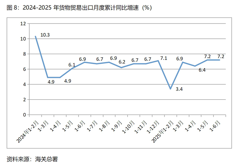 下半年GDP保持4.8%以上的增速,有政策實施、有趨勢慣性以及上年穩(wěn)定基數(shù)等因素的支撐。上半年積極的財政政策通過擴大支出、適度寬松貨幣政策通過降準降息、擴大內(nèi)需通過設備更新和以舊換新等政策措施,在下半年將會繼續(xù)發(fā)揮作用,加之下半年積極財政政策和適度寬松貨幣政策的繼續(xù)實施,“兩重”、“兩新”政策等一系列政策措施的落實,對下半年經(jīng)濟增長形成了有力支持。上半年GDP的較快增長,對下半年GDP增長發(fā)揮著慣性的作用,加之下半年GDP增長基數(shù)與上半年基數(shù)均是5.0%,穩(wěn)定的基數(shù)有利于下半年GDP增長4.8%以上。