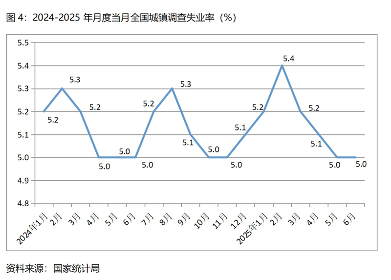 (三)調(diào)查失業(yè)率比一季度下降,比上年同期上升。上半年平均調(diào)查失業(yè)率為5.2%,比一季度平均調(diào)查失業(yè)率的5.3%下降 0.1個百分點,比上年同期的5.1%上升了0.1個百分點。其中,1月份為5.2%,2月份為5.4%,3月份為5.2%,4月份為5.1%,5月份為5.0%,6月份為5.0%,呈現(xiàn)出動態(tài)變化走低的態(tài)勢。
