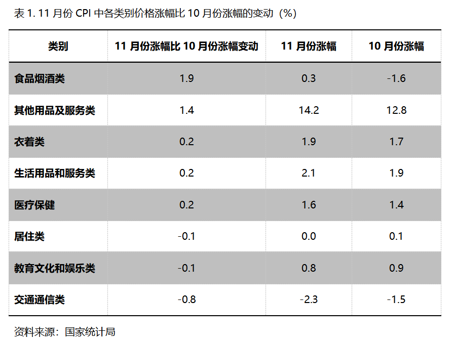 11月份,在CPI 8個(gè)類(lèi)別中有5個(gè)類(lèi)別同比漲幅回升,3個(gè)類(lèi)別回落。漲幅回升的5個(gè)類(lèi)別包括食品類(lèi)價(jià)格由降轉(zhuǎn)漲、漲幅回升1.9個(gè)百分點(diǎn),其他用品和服務(wù)類(lèi)漲幅回升1.4個(gè)百分點(diǎn),衣著類(lèi)、生活用品及服務(wù)類(lèi)和醫(yī)療保健類(lèi)漲幅均回升0.2個(gè)百分點(diǎn);居住類(lèi)、教育文化和娛樂(lè)類(lèi)漲幅均回落0.1個(gè)百分點(diǎn),交通通訊類(lèi)降幅擴(kuò)大0.8個(gè)百分點(diǎn)。