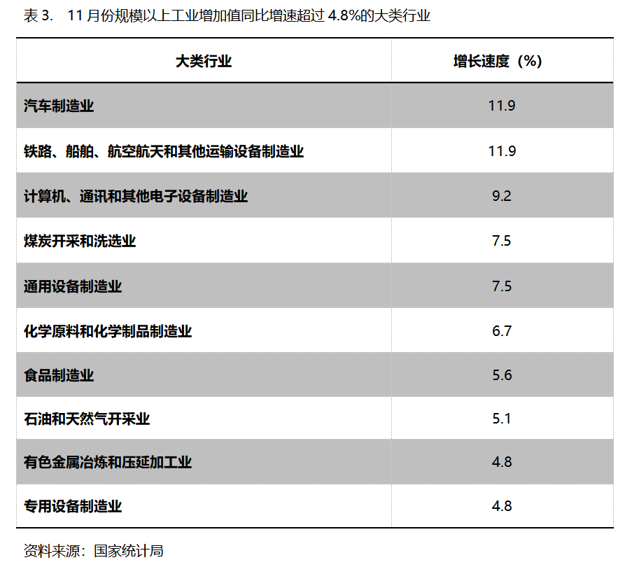 11月份,增長(zhǎng)速度超過(guò)或持平規(guī)模以上工業(yè)增長(zhǎng)4.8%的主要大類(lèi)行業(yè)共有10個(gè),即汽車(chē)制造業(yè)同比增長(zhǎng)11.9%,鐵路、船舶、航空航天和其他運(yùn)輸設(shè)備制造業(yè)增長(zhǎng)11.9%,計(jì)算機(jī)、通訊和其他電子設(shè)備制造業(yè)增長(zhǎng)9.2%,煤炭開(kāi)采和洗選業(yè)增長(zhǎng)7.5%,通用設(shè)備制造業(yè)增長(zhǎng)7.5%,化學(xué)原料和化學(xué)制品制造業(yè)增長(zhǎng)6.7%,食品制造業(yè)增長(zhǎng)5.6%,石油和天然氣開(kāi)采業(yè)增長(zhǎng)5.1%,有色金屬冶煉和壓延加工業(yè)增長(zhǎng)4.8%,專(zhuān)用設(shè)備制造業(yè)增長(zhǎng)4.8%。